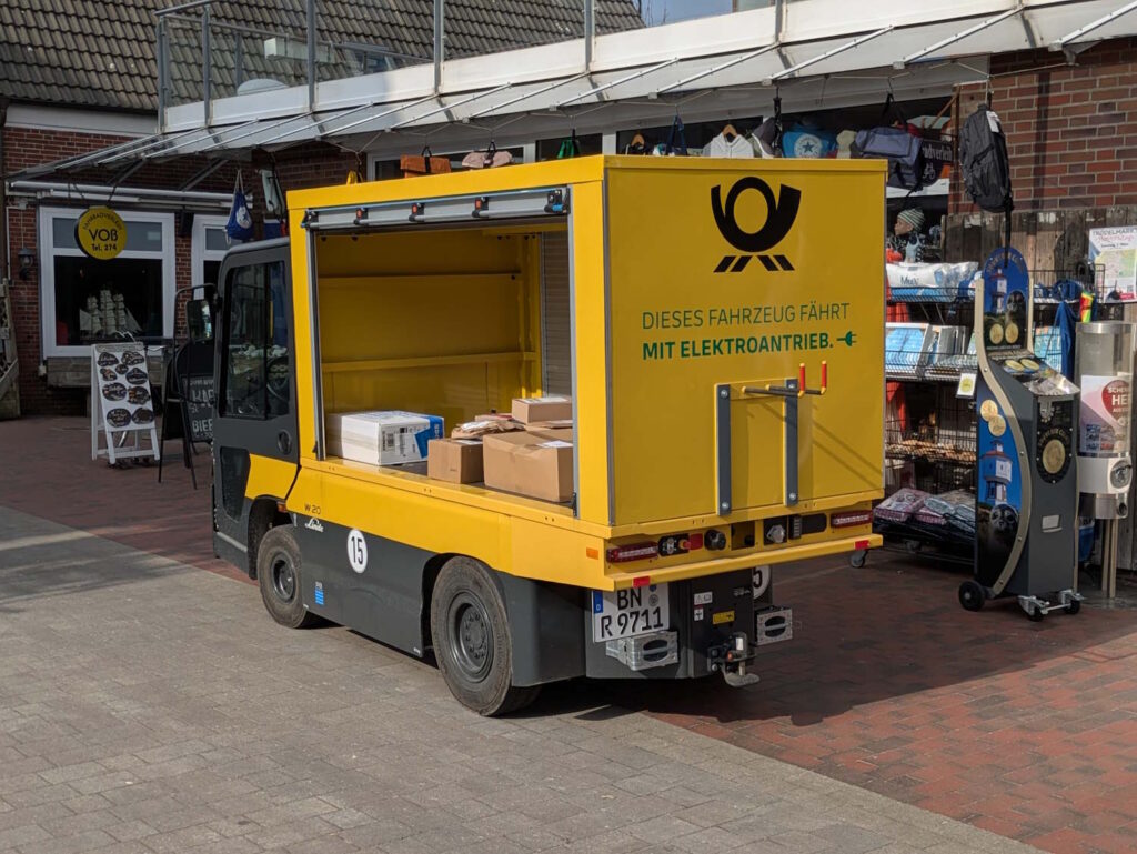 Während Briefe klassisch per Fahrrad zugestellt werden, benötigt die Paketzustellung eine speziellere Lösung. Hier kommt das Zustellfahrzeug auf Basis eines Linde Plattformwagens zum Einsatz – ein kleines, elektrisch betriebenes Fahrzeug, das von der Grundstruktur an den Streetscooter vom Festland erinnert.